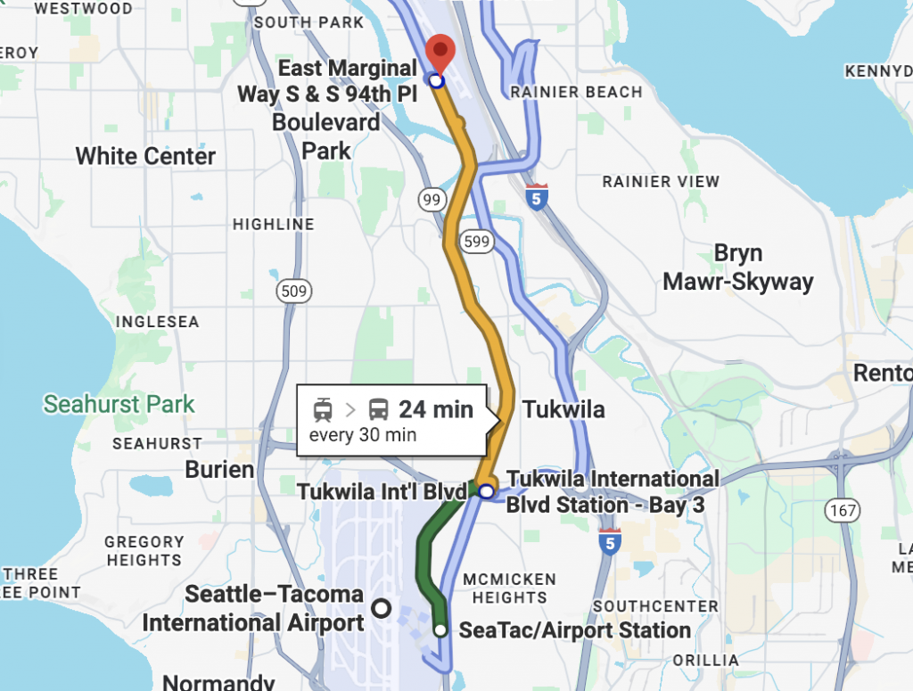 從西雅圖機場Sea Tac/Airport Station站搭乘Link輕軌,搭一站到Tukwila Int’l Blvd站,然後再轉乘公車經過大約十多分鐘的車程至East Marginal Way S & S 94th Pl站就抵達飛行博物館。
