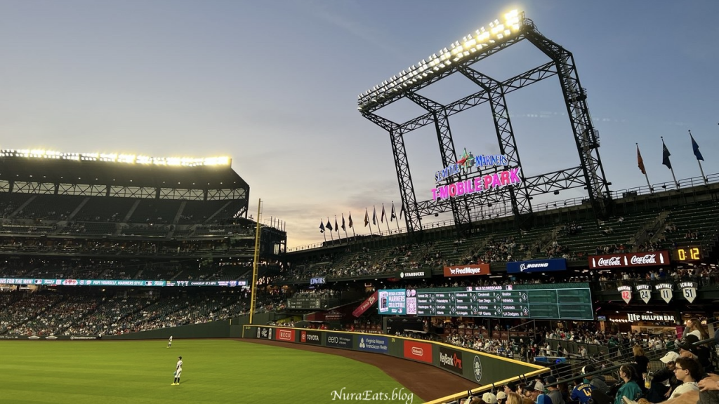 球場裡的氣氛很 Chill,在球場裡有很多美食攤位。從加州來西雅圖感覺亞洲人比例真的少很多,原本看網路上介紹有鼎泰豐攤位,實際到場才發現已經不在了有點失望,但是我們買了熱狗和日式炒麵兩樣都超級好吃。